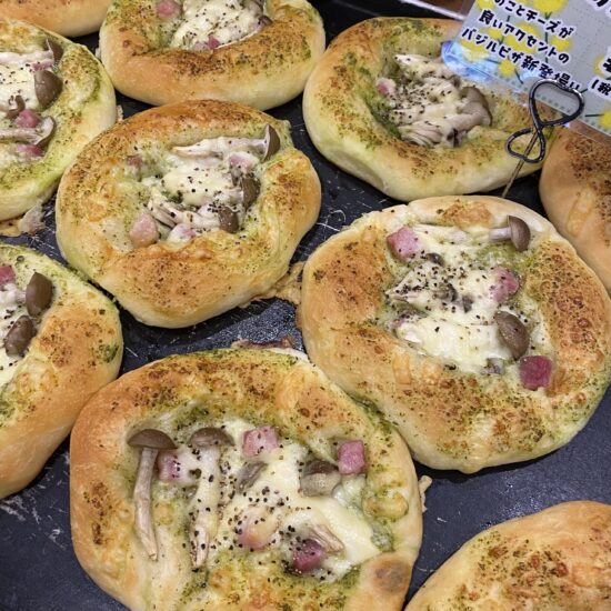 バジルが爽やかなミニピザに、ブラックペッパーを効かせました。しめじとベーコンで旨みたっぷりです。