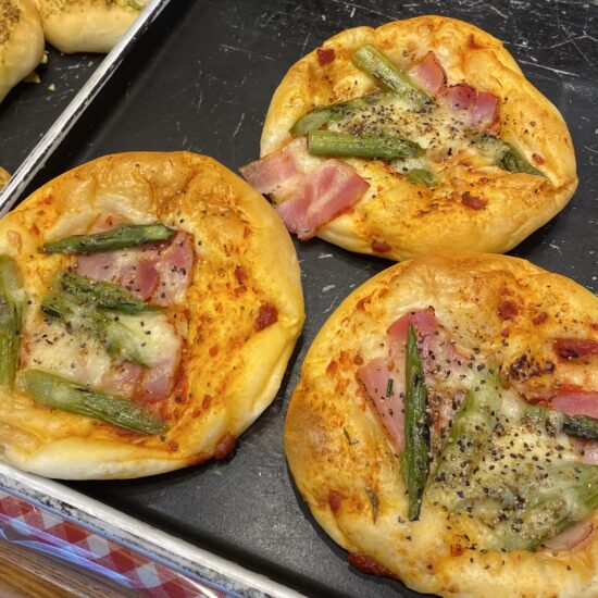 アスパラ・ベーコン・チーズと自家製ピザソースの旨みが溶けあうミニピザ。焼きたてあつあつをぜひ。